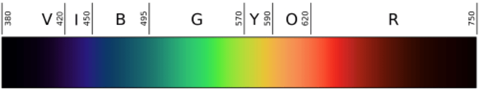 Spectrum of visible light: Isaac Newton gave us the now familiar list of seven wavelengths of light that we can see: Red, Orange, Yellow, Green, Blue, Indigo (a wavelength of light roughly 420 to 450 nanometers long), and Violet.