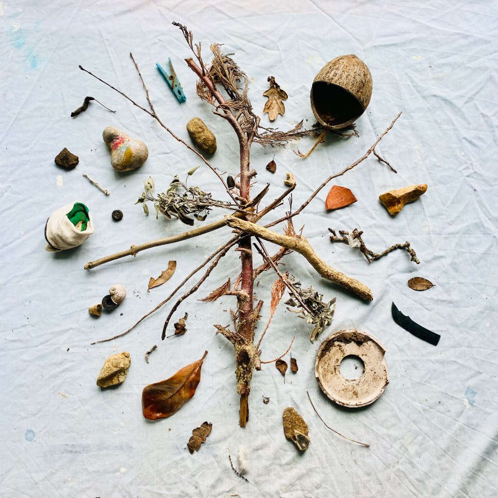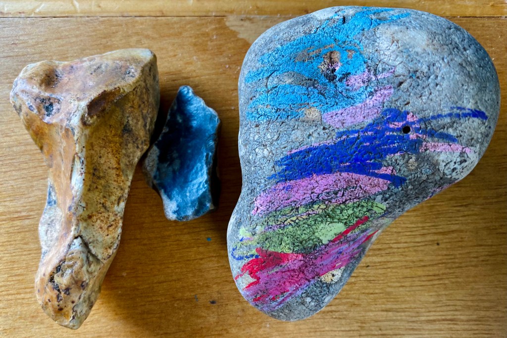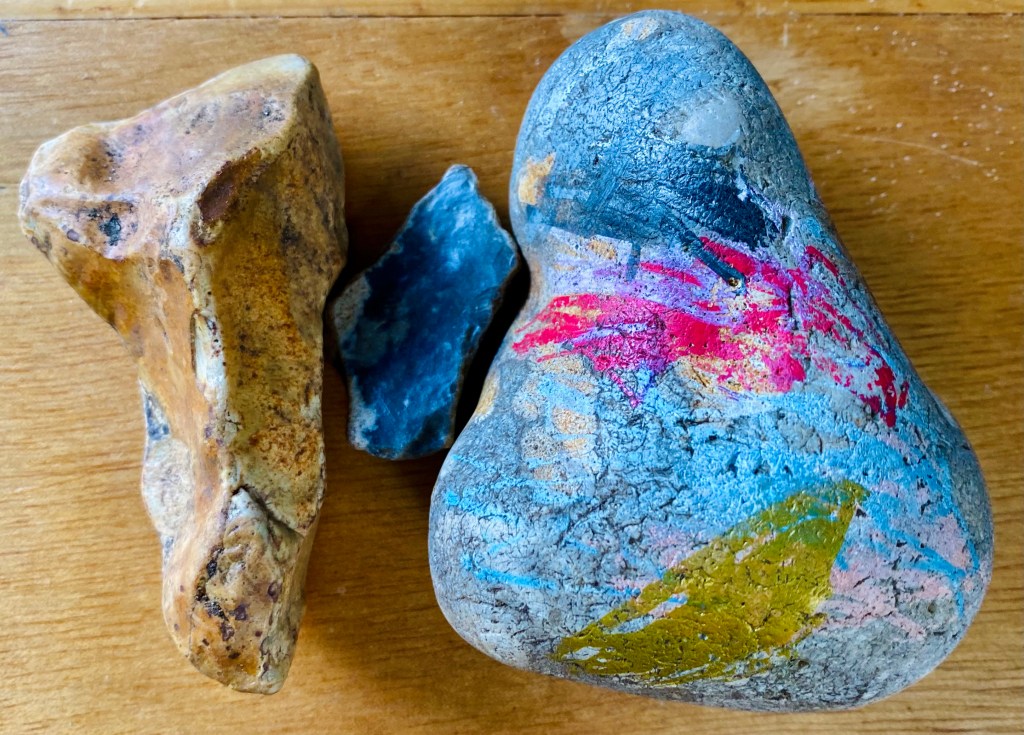 I arrived at February 2023 in a post-viral fatigue fug, feeling beset by depression, with my ‘tank’ utterly depleted. Thanks to the Abbey of the Arts scholarship scheme, I was able to join a group of monks making a Lent pilgrimage online, exploring what it might mean to make ‘A Different Kind of Fast’, led by our Abbess and a wonderful, multi-disciplinary team Each week ended with an invitation to practice a creative act of integration and reflection. At the end of week two, Christine’s ‘creative ritual’ encouraged us to make an earth mandala. I live with chronic illness so although I wasn’t well enough to go for a contemplative walk/wheel, I could make a semi-circle of seven steps from my studio door. I had moved to a new house in the summer of 2022, and I was still very much dreaming about what my frost-bound English garden might become, but I was staggered to collect the (previously unseen) objects which form this mandala. To find so many expressions of ‘here’, ’home’, and ‘gift’, which previous inhabitants or visitors had left for me to find, and within such a small area, was (literally) eye-opening. During the course of Holy Week, as I sat in turn with different elements from the mandala, I was drawn to the stones repeatedly, and in particular, to the painted stone which had been half-buried, dropped down the side of a raised bed. As I sat touching and looking at its’ curves, edges and facets I found a vision which led to a painting; and as I sat on, words and phrases for a poem arrived.