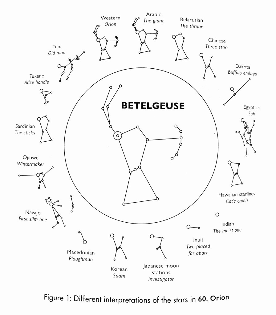 On day 8 I quoted astronomer Dr Maggie Aderin-Pocock whose book The Art of Stargazing describes how to name a star, and explains that ‘whereas (in the Western tradition) the planets of the Solar System are named after gods of classical mythology, we tend to know stars by the Arabic names given to them by medieval Islamic astronomers’ (22). However, she also includes a fascinating diagram of the names different cultures have for the star which we now know as Orion or Betelgeuse (2).