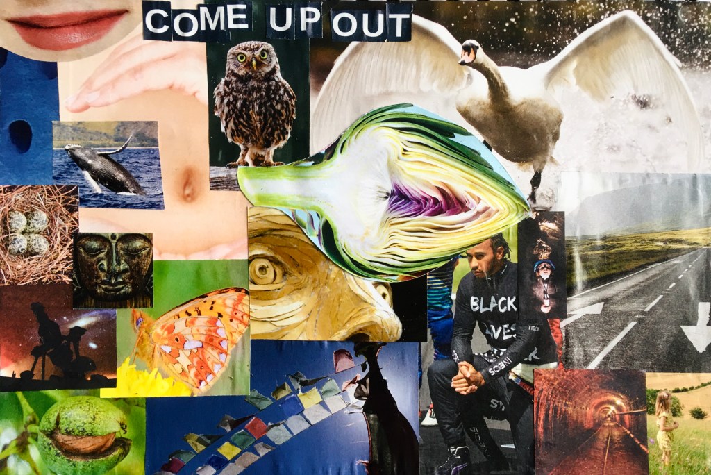 In 2020 I finally got round to extending the sabbath process into an even more holistic, reflective practice, so that both the word/short phrase, and the collage, were brought into the ‘real life’ of my week. So, after letting these gifts settle for a couple of days, I work with this collage as the basis for a Visio Divina practice, and using an adapted expressive arts/mindful technique, I produce what I call, an ‘I AM reflection’.